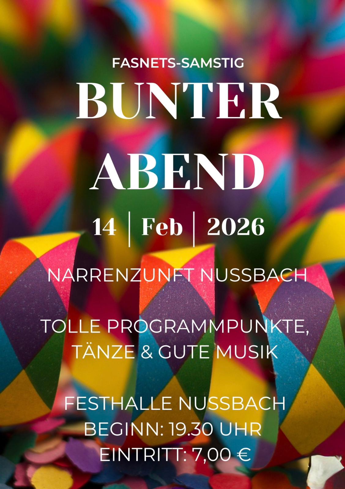 Festhalle Klosterstraße 12, Nußbach, Deutschland10.00 Uhr Halle fertig richten 18.30 Saaleröfnung 19.30 Bunter Abend (im Häs Einmarschpflicht)