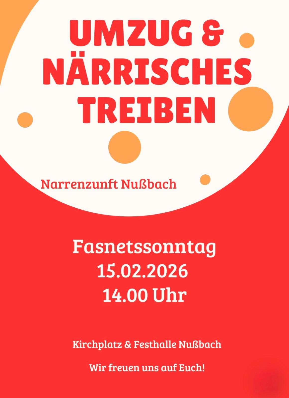 Festhalle Klosterstraße 12, Nußbach, Deutschland3.00 Uhr Aufräumen 12.00 Uhr Kuchentheke aufbauen 14.00 Uhr Umzug Anschl. Treiben in der Halle